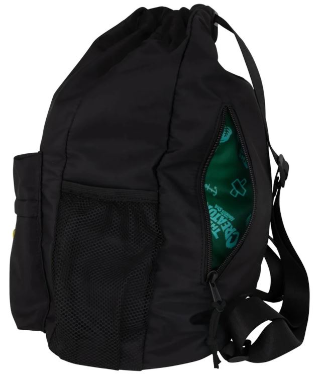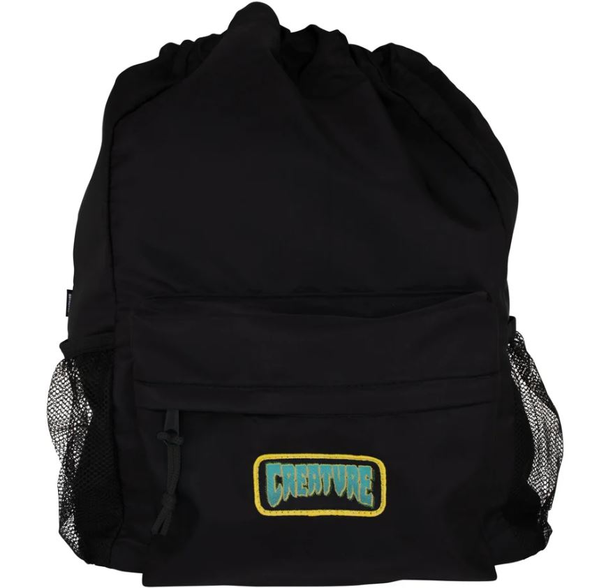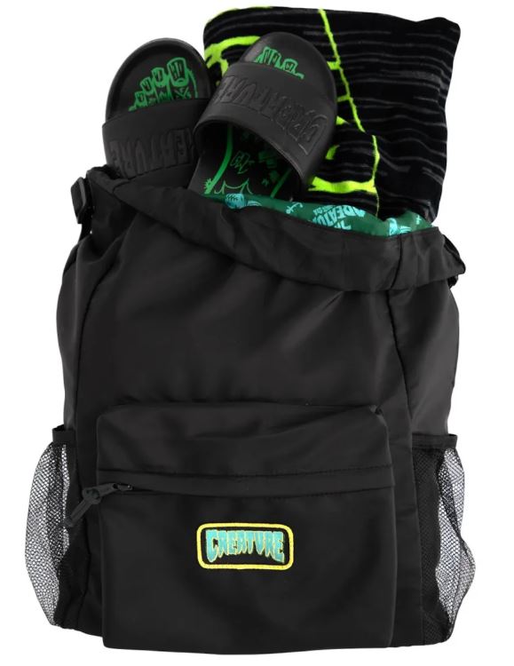 The Creature Haunted Sea backpack features durable PVC bottom, cinch closure for main compartment, front exterior zipper pocket with embroidered twill patch, back zipper pocket, interior zipper pocket, mesh side pockets, adjustable straps, locker loop, printed lining, and custom zipper pulls with tied drawcord pulls.