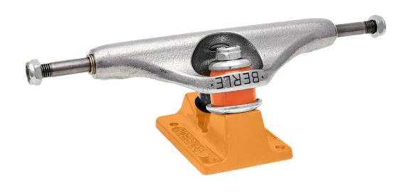 The Independent Skull Elijah Berle 159 Stage 11 Skateboard Trucks featuring pad printed art by Elijah, pad printed BERLE on yoke, with polished silver hanger, flat orange baseplate, orange cushions and silver hardware.